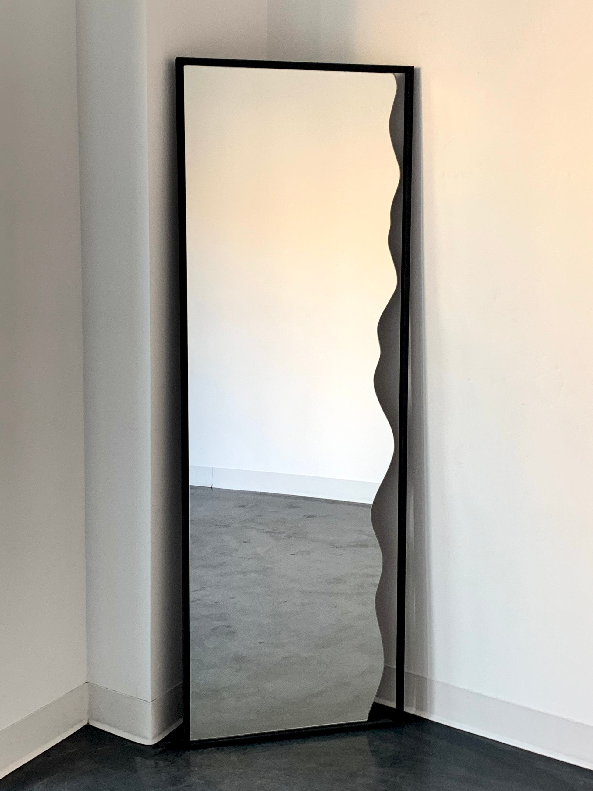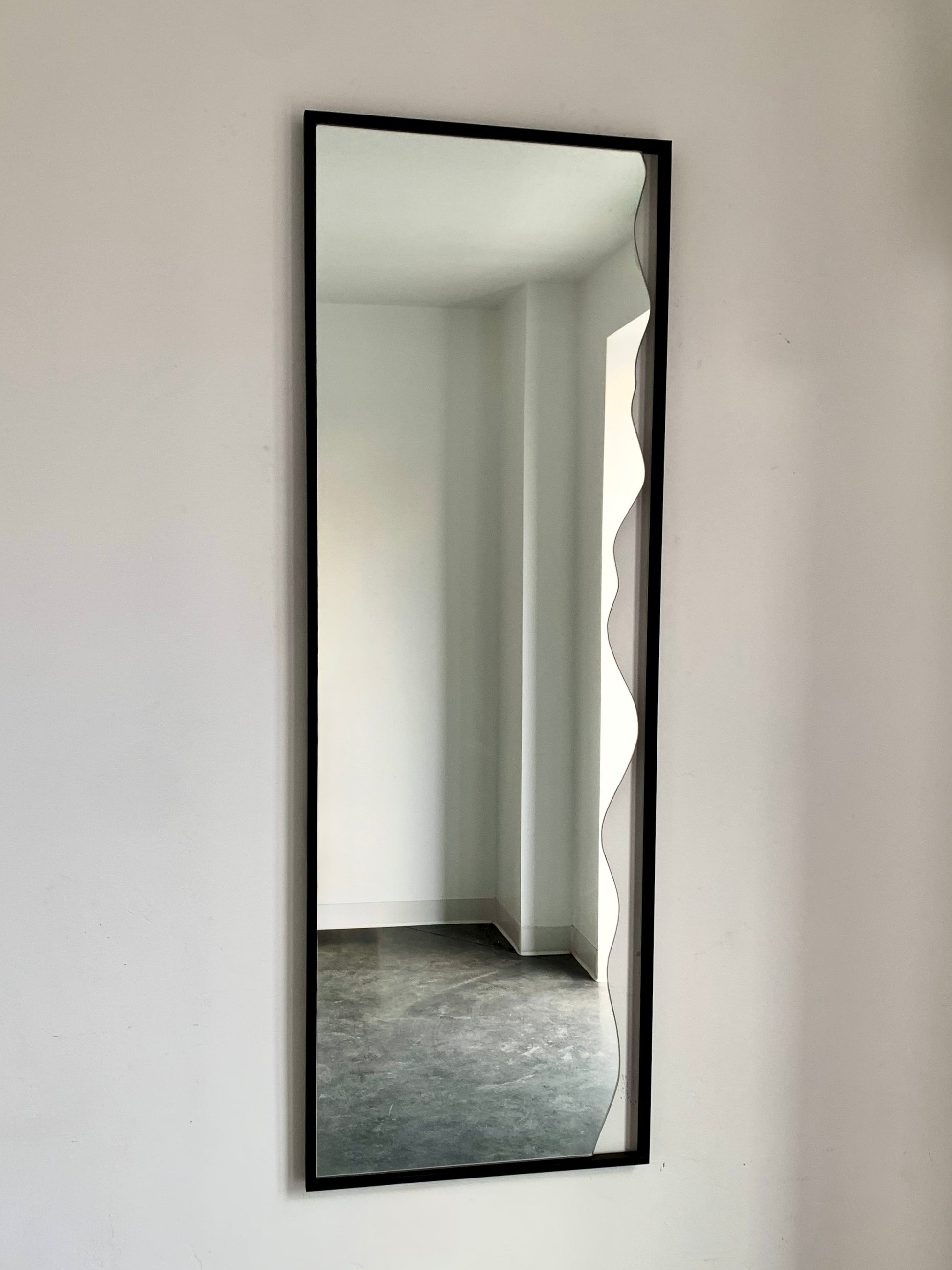 Our Organic Edge Full-Length Mirror exudes luxury. Expertly crafted, this mirror features a striking amoeba-shaped edge, blending organic design with modern aesthetics. The sleek, black metal frame enhances its contemporary look, making it a standout piece for any room. Measuring 20 inches by 60 inches, this mirror not only adds visual depth but also serves as a functional piece of art. Ideal for bedrooms, living areas, or any space that requires a touch of unique style.